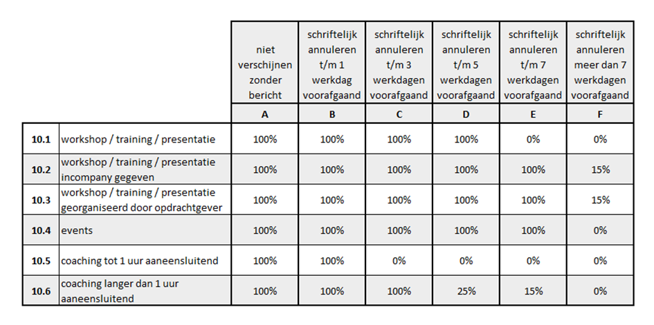 8.1 Indien de klant een dienst (zoals een workshop of training) wil annuleren, dient dit schriftelijk of per e-mail te gebeuren.